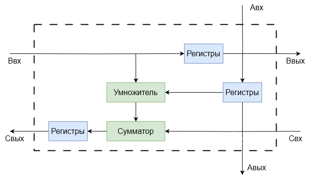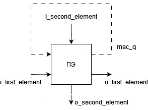 $${mac\_ q}^{n}\ = \ {mac\_ q}^{n - 1}\ + \ {i\_ first\_ element}^{n - 1} \times {i\_ second\_ element}^{n - 1}$$на основе операндов, полученных на (n – 1)-м шаге, при этом операнды на входе и выходе ПЭ одинаковы: