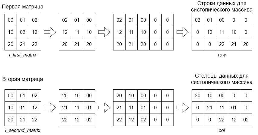 Для корректного вычисления входные матрицы должны быть преобразованы. Для этого в модуле описан блок подготовки и преобразования входных данных. Когда устанавливается сигнал i_ready, входные матрицы преобразуются в матрицы row и col, как показано на рисунке 30. Для каждой строки матрицы i_first_matrix положение элементов инвертируется, добавляется нулевое заполнение, и происходит сдвиг строк вправо, чтобы сформировать матрицу row с правильным временным выравниванием. Каждый столбец матрицы i_second_matrix транспонируется (преобразуется в строку) и инвертируется, добавляется нулевое заполнение, и происходит сдвиг строк вправо, чтобы сформировать матрицу col с правильным временным смещением.