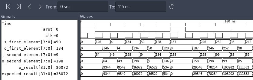 Логика работы модуля следующая: данные из входных портов защелкиваются, когда устанавливается входной порт i_ready. Входные элементы перемножаются между собой при активном уровне сигнала i_ready. К данному произведению добавляется результат предыдущего шага mac_q. Полученный результат помещается в mac_d, который защелкивается в mac_q на следующем такте. Входные операнды передаются на выход схемы. Данные из mac_q поступают на результирующий выход схемы o_result.
