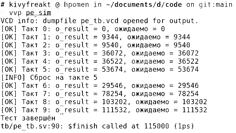 Моделирование работы процессорного элемента было проведено с использованием средства для симуляции и отладки Verilator с открытым исходным кодом. Этот инструмент преобразует HDL-код в оптимизированную модель на языке С++ для быстрой симуляции. Кроме того, Verilator один из немногих открытых проектов, который имеет довольно полную поддержку стандарта SystemVerilog. Визуализация временных диаграмм, получаемая после работы симулятора Icarus Verilog, сгенерирована при помощи инструмента GTKWave с открытым исходным кодом. Временная диаграмма проверки и вывод тестовой программы для размерности матриц $N\ = \ 3$ представлены на рисунках ниже.