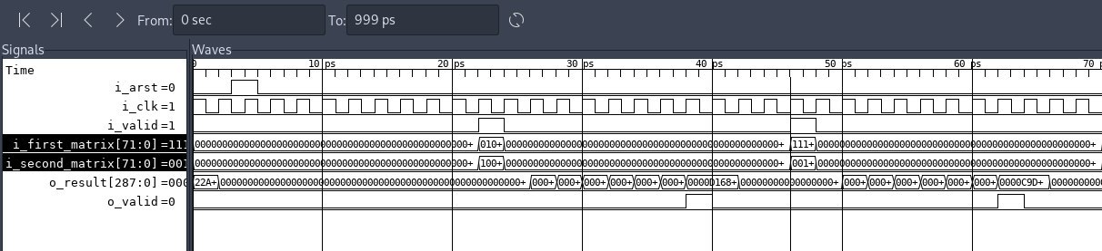 Интерфейс общения с этим модулем достаточно прост. Помимо тактового сигнала i_clk и сигнала асинхронного сброса i_arst, имеем два входных порта для управления матрицами i_first_matrix и i_second_martix. Данные из этих портов защелкиваются, когда устанавливается входной порт i_ready. Затем входные матрицы преобразуются и передаются в систолический массив для умножения. Когда умножение завершено, выставляется выходной порт o_valid и можно брать значения из порта o_result.