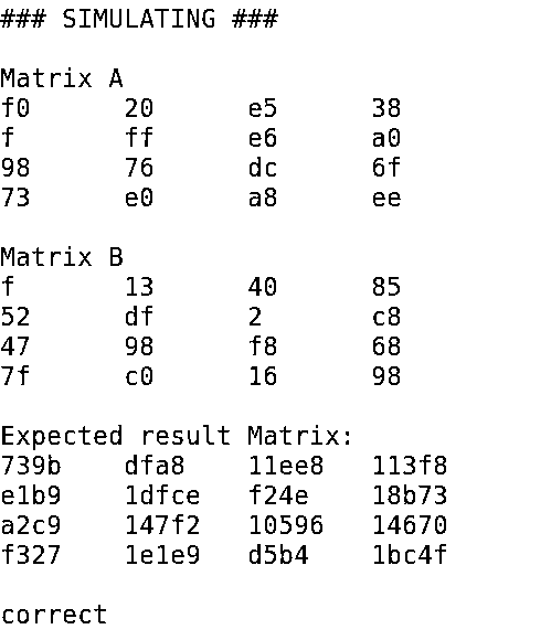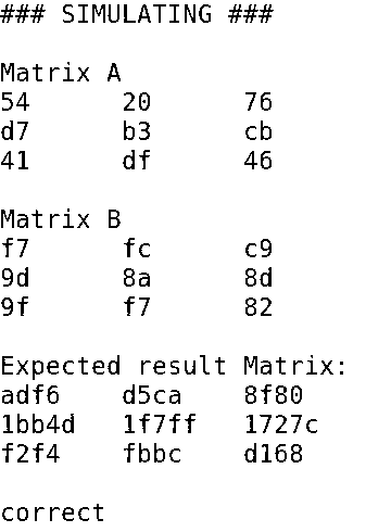 После проверки корректности работы вычислительного модуля, можно проверить работу всего умножителя в целом. Для верификации работы устройства был создан базовый тестовый стенд на языке С++, состоящий из нескольких функций для реализации проверки умножения квадратных матриц произвольного размера. Схема проверки представляет собой создание случайных матриц размера $N \times N$, подачу этих матриц на тестируемое устройство, ожидание конца вычислений устройства, вычисления матрицы корректного результата и проверки эквивалентности полученных результирующих матриц. Все это повторяется некоторое количество раз, заданное в параметре модуля. Программа должна выводить на экран входные матрицы и ожидаемую матрицу результата. Если произошла ошибка, полученная выходная матрица также будет распечатана, и симуляция завершится.