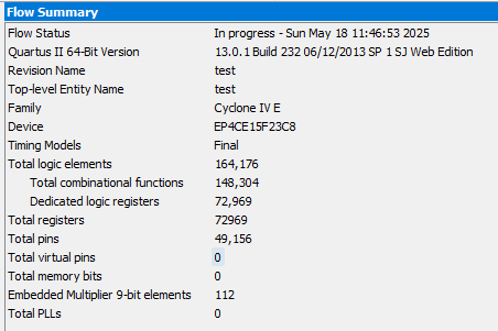 Из рисунка видно, что синтез прошел успешно, указано количество используемых логических и комбинационных элементов на ПЛИС, количество используемых регистров и пинов, а также встроенных 9-битных умножителей.