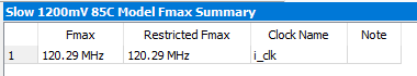 Рассмотрим максимальную тактовую частоту, с которой возможно запустить эту схему. Для этого воспользуемся инструментом TimeQuest Timing Analyzer, который позволяет анализировать временные характеристики проектов на ПЛИС. Этот инструмент предоставляет несколько моделей, нам интересен наихудший случай с максимальными задержками, поэтому рассмотрим модель Slow 1200mV 85C Model. Оценка максимально возможной тактовой частоты схемы представлена ниже.