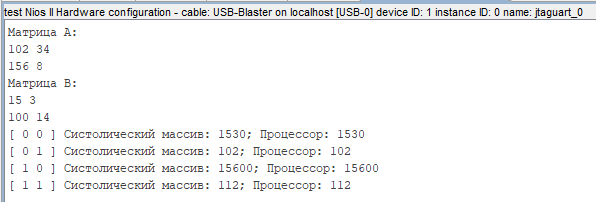 Перейдем к эксперименту по проверке работы схемы на отладочной плате с ПЛИС Cyclone IV E EP4CE15F23C8. Для этого создадим проект с soft-процессором NiosII и подключим к нему устройство умножения матриц на основе систолического массива.