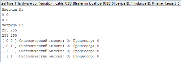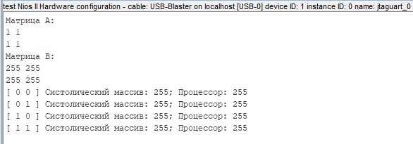 Следующим шагом необходимо написать тестовую программу, которую будет выполнять soft-процессор. Для этого необходимо создать проект во встроенной IDE NiosII Software Build Tools for Eclipse. После создания проекта и генерации BSP файлов, была написана тестовая программа для проверки работы систолического массива.