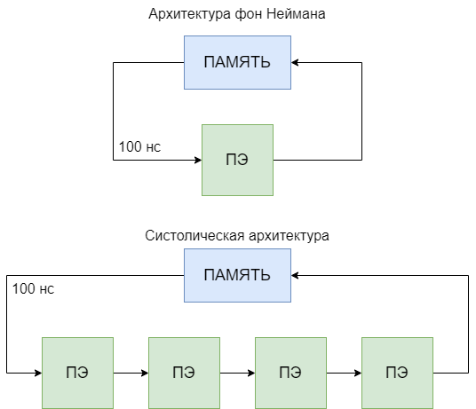 В классических фон-неймановских вычислителях данные, считанные из памяти, однократно обрабатываются в процессорном элементе (ПЭ), после чего снова возвращаются в память. Доступ к памяти является узким местом таких архитектур, что критично для многих задач, в частности для задачи умножения матриц. Авторы идеи систолической матрицы Кунг и Лейзерсон предложили заменить один элемент обработки на массив таких процессорных элементов. Вычисления при таком раскладе будут организованы так, что данные на своем пути от считывания из памяти до возвращения обратно пропускаются через как можно большее число процессорных элементов. Этот трюк позволяет добиться более высокой производительности вычислений без увеличения пропускной способности памяти. Суть подхода заключается в том, чтобы гарантировать, что после извлечения данных из памяти, эти данные будут эффективно использованы в каждой ячейке, которую они проходят, будучи “перекаченными” из одной ячейки в другую ячейку по массиву